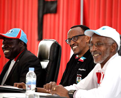 TOP BRASS: RPF Chairperson Kagame (C), Vice Chairperson Bazivamo (L) and Secretary-General Ngarambe at the ruling party’s national congress at Petit Stade Remera, Kigali, yesterday. The New Times/ Timothy Kisambira.