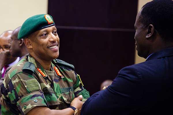 Chief of Defence Forces, Gen Patrick Nyamvumba (L), chats with Maj. Gen. Francis Okello of Uganda. Military and police chiefs from Uganda, Kenya and Rwanda met in Kigali to discuss....