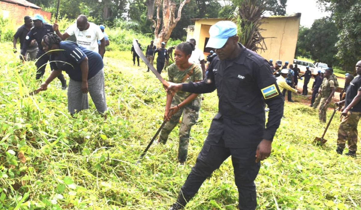 Rwanda Formed Police Unit Three (RWAFPU-3) deployed in Bangassou under the UN Multidimensional Integrated Mission in Central Africa Republic (MINUSCA), on Saturday, August 26, joined residents the local residents of Ngombe village, Mbomou Prefecture in a communal work, Umuganda. The communal exercise focused on sanitation and hygiene activities to fight and prevent illnesses caused by poor hygiene like malaria and gasto-intestinal diseases. The Rwandan police peacekeepers headed by their contingent commander, Senior Superintendent of Police (SSP) Athanase Ruganintwari, were also joined by the Governor of Mbomou, Bengurre Pierrette, the Police Commissioner, Theodore Greraze as well as the Central African army (FACA) in Mbomou, and the UN Police personnel deployed in MINUSCA Bangassou Field Office. The exercise involved bush clearing, collecting litter and opening water trenches. Governor Bengurre commended the Rwandan peacekeepers for the continued contribution towards security, health, and the wellbeing of the local people. She added that such communal activities promote the ideals of self-reliance and urged the residents to embrace this culture. We thank Rwanda FPU for organizing this communal exercise, which is very important to us. We have entered into the rainy season thus slashing bushy neighborhoods and promoting hygiene is key to fighting especially malaria. I encourage our citizens and particularly residents of Mbomou to embrace such ideals and conduct Umuganda every Saturday, Madam Bengurre said. SSP Ruganintwari said that the community work was in line with the existing partnership and to continue protecting residents against any threats to life, including poor hygiene and related diseases. The contingent commander urged the residents to own such activity for their social wellbeing, protect the environment, and called for continued partnership in ensuring their safety and security. One of the local residents, Richard Mbokakette, who participated in Umuganda, said that the activity is very important to them, and appreciated the Rwandan Police peacekeepers for being close to them. Rwandan Police peacekeepers have showed us a very good example to follow, working together in such social community exercise is very paramount. We don't have this good culture here in our country and it is necessary and beneficial to us as a community working together for the common cause, said Mbokakette. The Rwandan Formed Police Unit operating in Bangassou has since its deployment in November last year, conducted several community development activities, such as providing free medical services, conducting medication and health care to people of Bangassou as well as community policing activities like sports. The RWAFPU-3 of 180 officers is an additional contingent deployed in Bangassou city in November last year, about 720km out of the capital Bangui.
