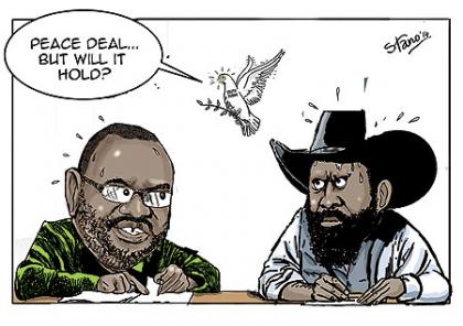 South Sudanese President Salva Kiir and his former deputy-turned-rebel commander Riek Machar on Friday signed a ceasefire to end a six-month conflict that has killed thousands and displaced a million others.