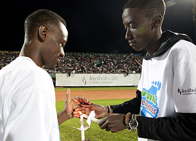 Two boys light candles during the 20th commemoration of the Genocide against Tutsi. Youth today have pledged to sustain a unified Rwanda. File.