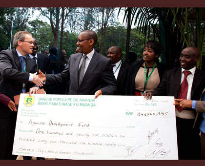 Staff of Bank Populaire give a dummy cheque worth over Rwf140m to former finance minister John Rwangombwa in 2012. John Mbanda.