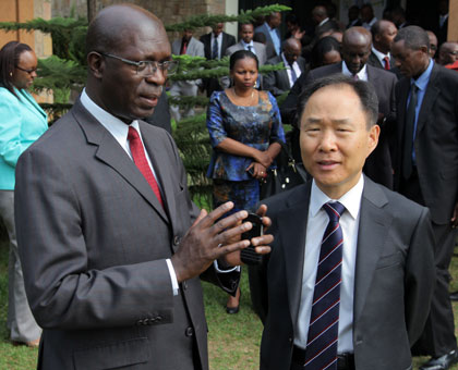 Labour minister Anastase Murekezi (L) chats with Korean Ambassador to Rwanda, Hwang Soon Taik, after the opening of the senior officials’ workshop yesterday. John Mbanda.