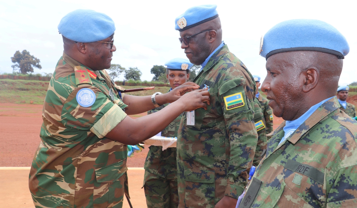 Rwandan peacekeepers under the United Nations Multidimensional Integrated Stabilization Mission in the Central African Republic (MINUSCA) were on Wednesday, September 20, decorated with UN service medals in recognition for their peacekeeping service. ALSO READ: Rwandan police peacekeepers provide free medical services to CAR citizens The event was held at Bria, in Haute-Kotto Province, Central African Republic. Today, Rwandan peacekeepers under United Nations Multidimensional Integrated Stabilization Mission in the Central African Republic (MINUSCA) were decorated with UN service medals in recognition for their peacekeeping service. https://t.co/D5bhoeZPAy pic.twitter.com/HOr5nG9a1r — Rwanda Defence Force (@RwandaMoD) September 20, 2023 The ceremony was presided over by MINUSCA Force Commander, Lt Gen Humphrey Nyone, who congratulated Rwandan peacekeepers for the good work done. ALSO READ: Rwandan peacekeepers hand over rehabilitated classrooms in CAR The senior contingent commander, Col Dr Osee Robert Karangwa, appreciated the good cooperation of the local leadership, MINUSCA leadership and friendly forces. The ceremony was attended by Head Office Bria, Dieng Bara with other Sector officials, local leadership, and other MINUSCA contingents. Rwanda is one of the largest troop contributors to MINUSCA where it has maintained peacekeepers since 2014. ALSO READ: President Kagame sheds light on troop deployments in CAR In 2020, Rwanda deployed “force protection troops” to the Central African Republic, under a bilateral agreement on defence.