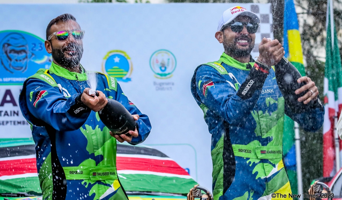 Kenyan driver Karan Patel (R) and his navigator Tauseef Khan spray champagne in celebration of their second consecutive Rwanda Mountain Gorilla Rally glory in Bugesera on Sunday, September 24. All photos by Dan Gatsinzi