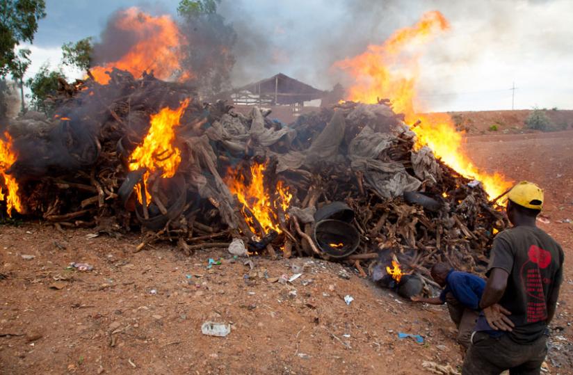 Workers at Nduba dumping site burn the sandalwood on Wednesday. (T. Kisambira)