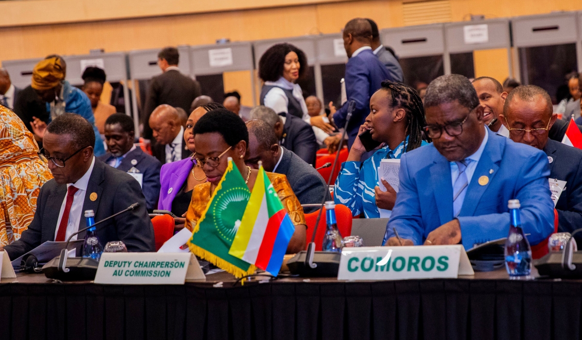 (L-R) Minister of Foreign Affairs Dr Vincent Biruta, Monique Nsanzabaganwa, the Deputy Chairperson of the African Union Commission and Minister of Foreign Affairs of Comoros Dhoihir Dhoulkamal during the opening session.