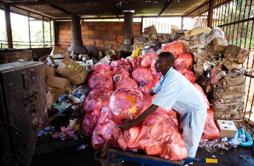 A worker at University Teaching Hospital of Kigali prepares waste to be disposed of in an incinerator. (Timothy Kisambira)