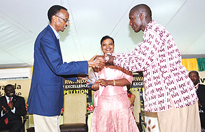 WELL DONE: President Paul Kagame handing over a trophy to the best coffee farmer at the Cup Of Excellence awards. (Photo PPU).