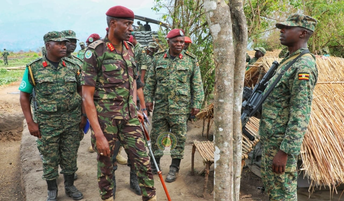 The Force Commander of the East African Community regional force, Maj Gen Aphaxard Kiugu, and other officers, visit Ugandan EACRF contingent, on August 12, in Rutshuru territory, eastern DR Congo. It remains unclear how the regional force will react to renewed hostilities. Photo: courtesy of EACRF
