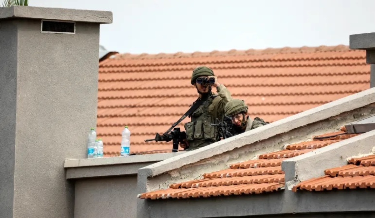 Israeli soldiers look out as they stand between buildings in Sderot, southern Israel [Amir Cohen/Reuters]
