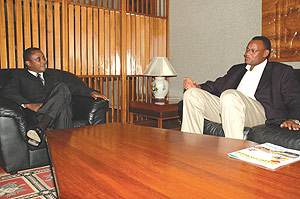 President of the Senate, Vincent Biruta (L) chats with EALA Speaker, Abdirahin Haithar Abdi on arrival at Kigali International Airport VIP Lounge (Photo/ G. Barya)