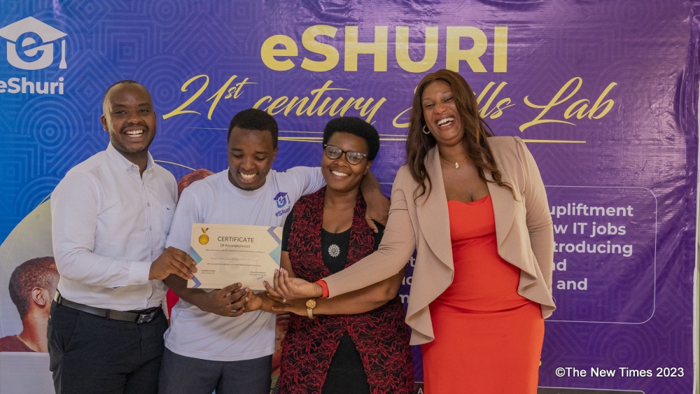 Officials pose for a group photo with some of the 75 high school graduates and seniors who completed hands-on software training at eShuri 21st