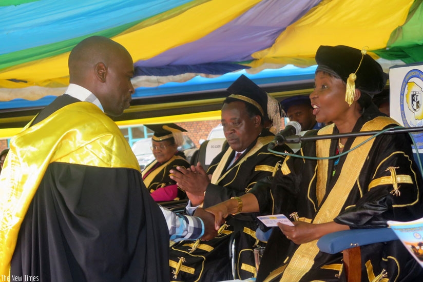 Dr. Asha Rose Migiro (L) confers a degree upon a graduate. (Stephen Rwembeho)