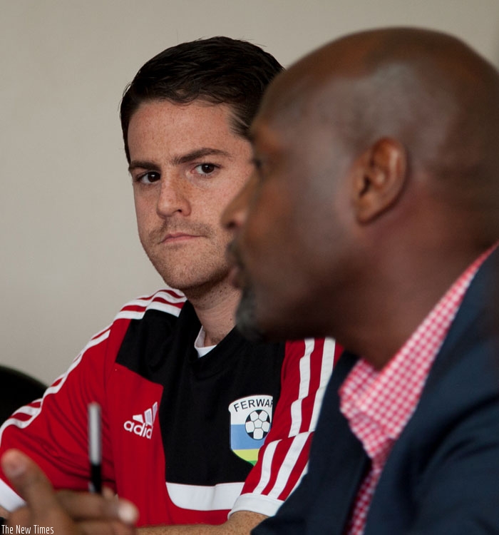 New Amavubi coach Johnny McKinstry looks on as Ferwafa boss Degaule Nzamwita addresses journalists yesterday. (Faustin Niyigena)