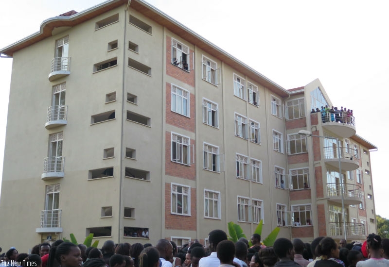 Students stand in front of the female hostel at UR CASS in Huye surveying the damage caused by the fire. Emmanuel Ntirenganya)