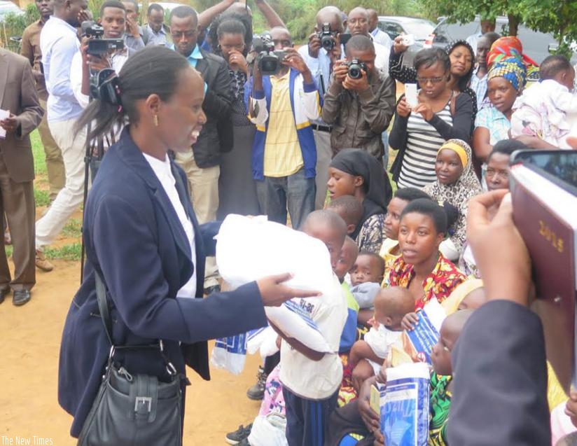 Dr Corine Karema distributes mosquito nets to families in Bugesera last month. (Ivan Ngoboka)