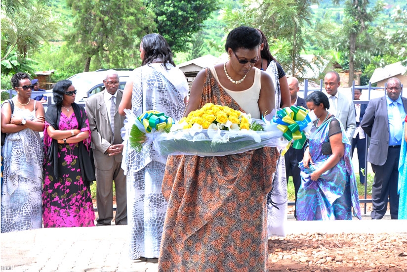 Speaker of Parliament Donatille Mukabalisa lays a wreath in memory of over 350 women and children killed during the 1994 Genocide against the Tutsi at Bambiro Mountain in Kibilizi Sector, Nyanza District (Courtesy)