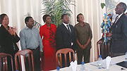 THANK YOU: NEC Chairman Chrysologue Karangwa (R) talks to Kigali City officials while presenting them an award.