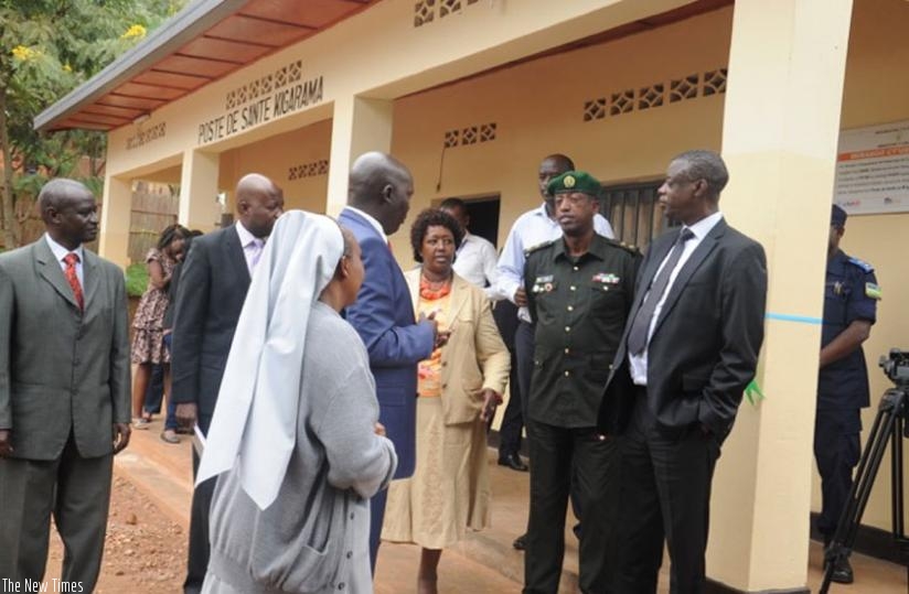 Dr. Binagwaho (C), Kabarebe (R) and other officials after the inauguration of Kigarama health post in Kicukiro District yesterday. (Ivan Ngoboka)