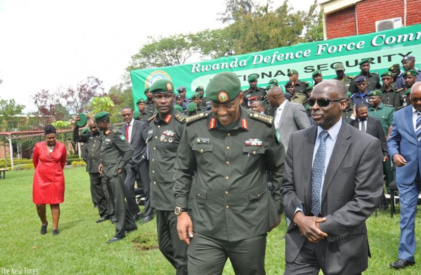 Gen. Nyamvumba chats with Prof Nelson Ijumba, the Deputy Vice-Chancellor Academics and Research,University of Rwanda, at the symposium yesterday. (Jean d'Amour Mbonyinshuti)