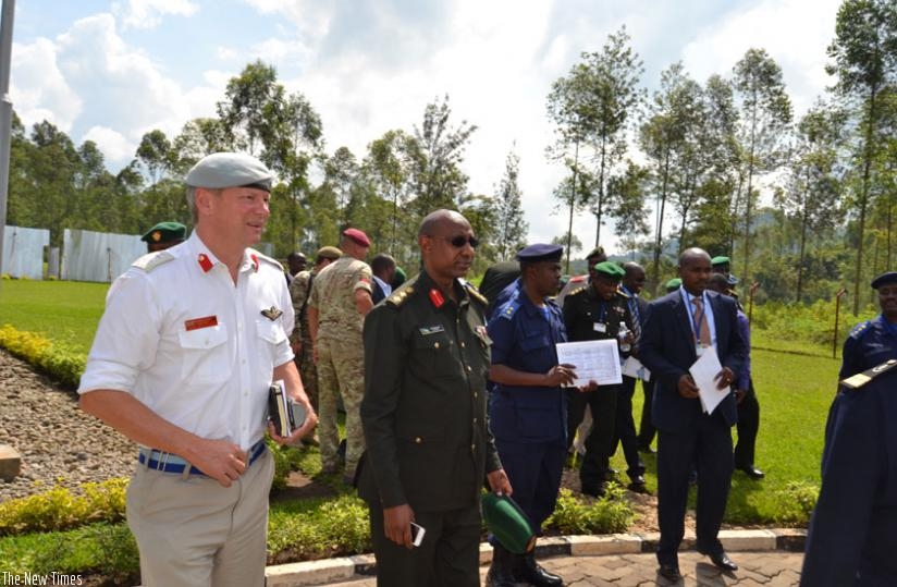 Col. Leakey (L) with Col. Rutaremara and other officials at the closure of the Civil-Military Cooperation Course in Musanze District. (Jean d'Amour Mboyinshuti)
