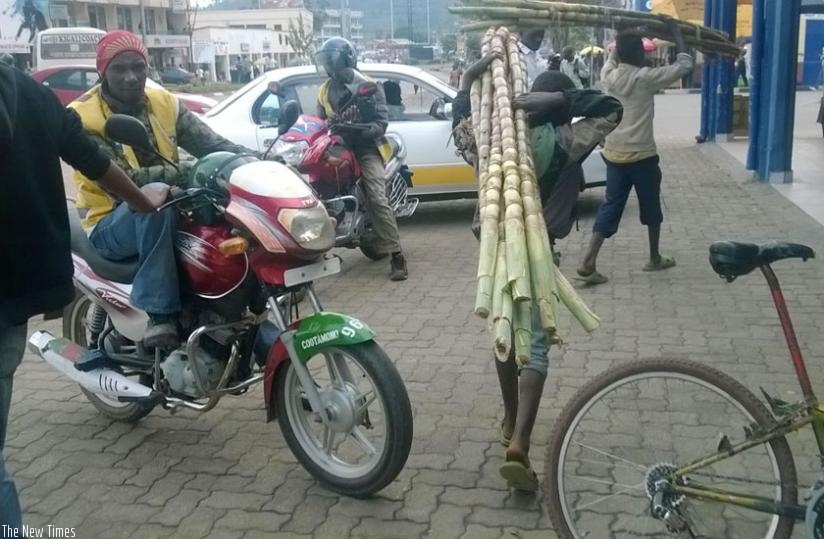 Nshimiyimana (foreground) and another child carry sugar cane to Musanze market. (J.Mbonyinshuti)