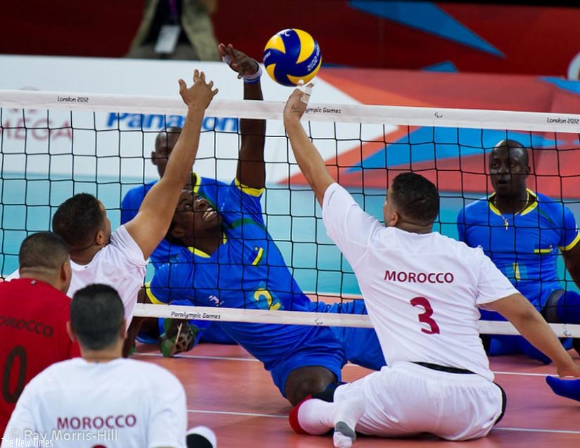 Vincent Tuyisenge defends against Morocco's Hicham El Jamili at the 2012 London Paralympic Games. Rwanda won 3-1 against Morocco in the 9-10 Classification match. (Courtesy)
