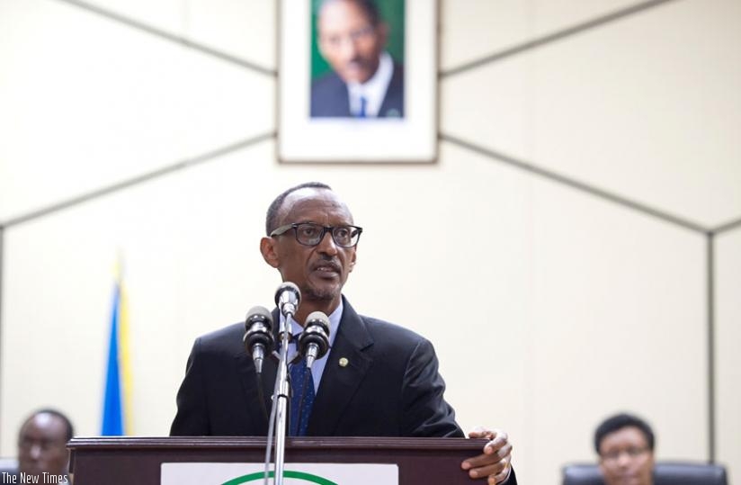 President Kagame speaks at Parliament as he presides over the swearing in of new Education minister, legislators and judges yesterday. (Village Urugwiro)