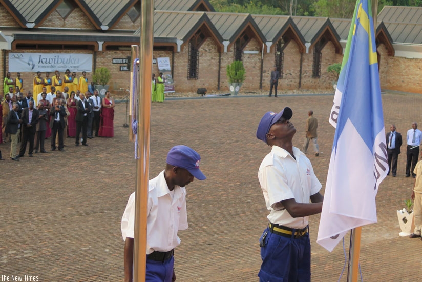The Institute of National Museums of Rwanda flag is hoisted as participants look on in Huye District on Thursday. (Emmanuel Ntirenganya)