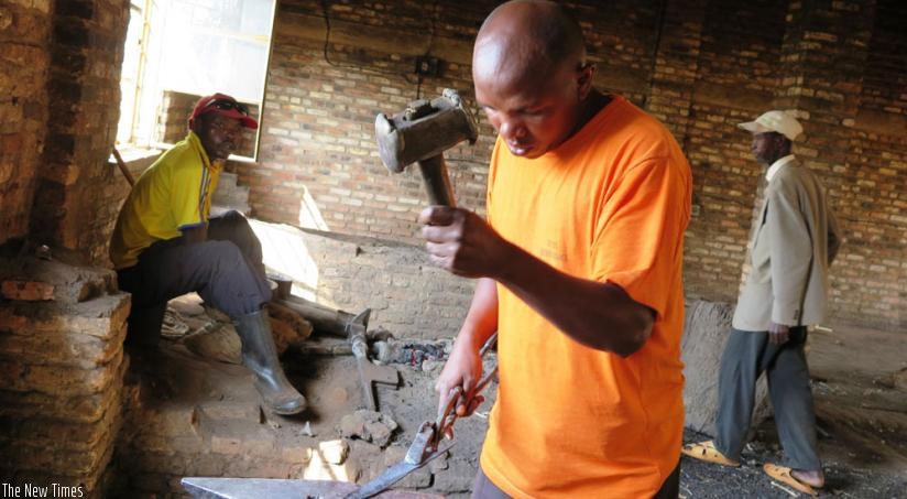 Havugimana fabricates a kitchen knife. (Emmanuel Ntirenganya)