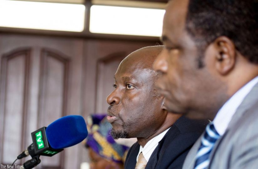 Prof. Ijumba( L), flanked by other officials, address the media in Kigali yesterday. (Timothy Kisambira)