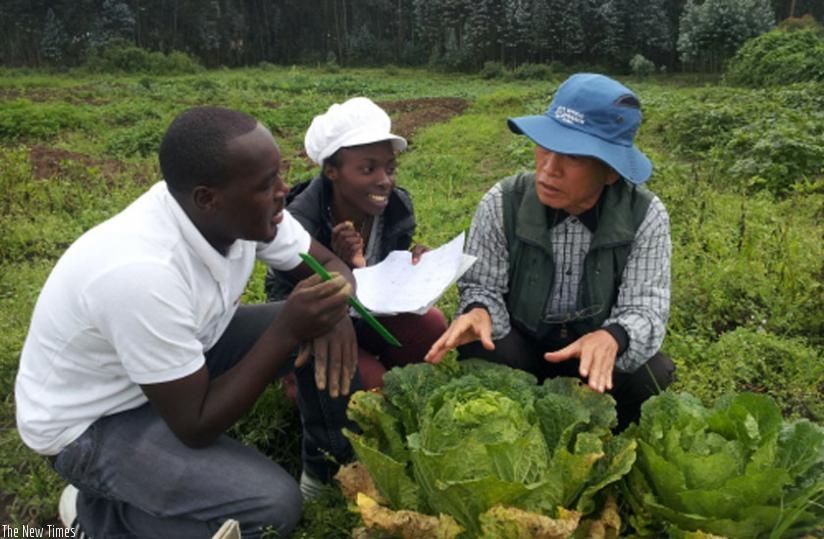 Dr Yu (R) with his students on the farm in Musanze where Korean cabbage are being experimented. (Jean d'Amour Mbonyinshuti)