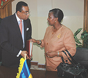 Foreign Affairs Minister Rosemary Museminali talks to Amb. Carlton A. Masters after signing an MoU at MINAFFET offices yesterday. (Photo J. Mbanda)