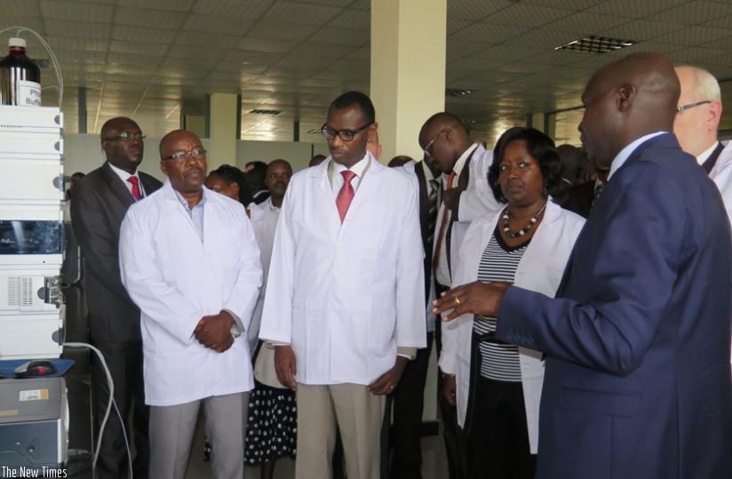 Karangwa (R) explains how equipment at the laboratory operate to Dr Binagwaho (2ndR), and Dr Musafiri (C) and other officials on Friday. (Emmanuel Ntirenganya)