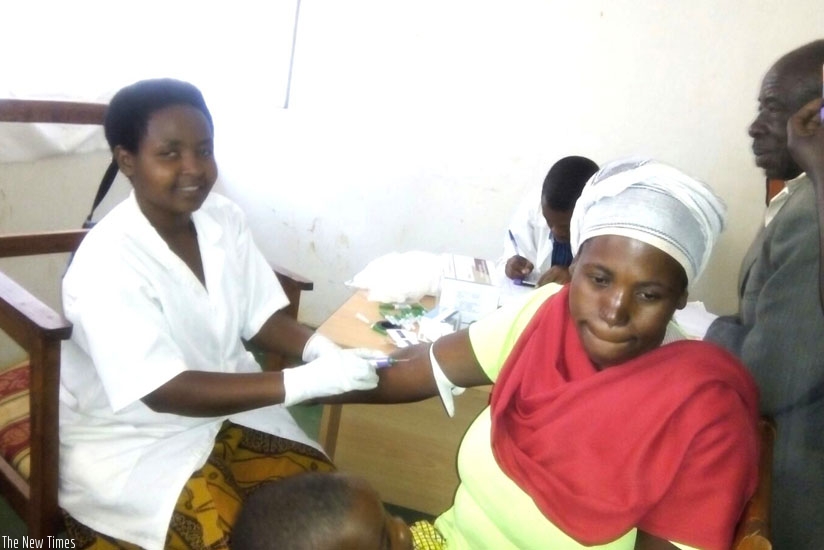 A nurse takes blood sample for HIV testing from a woman. (S. Rwembeho)