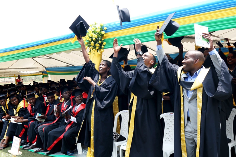 Graduates at IPRC Kigali toss their mortarboards during a graduation ceremony earlier this year. EAC is seeking to harmonise education system in partner states. (File)