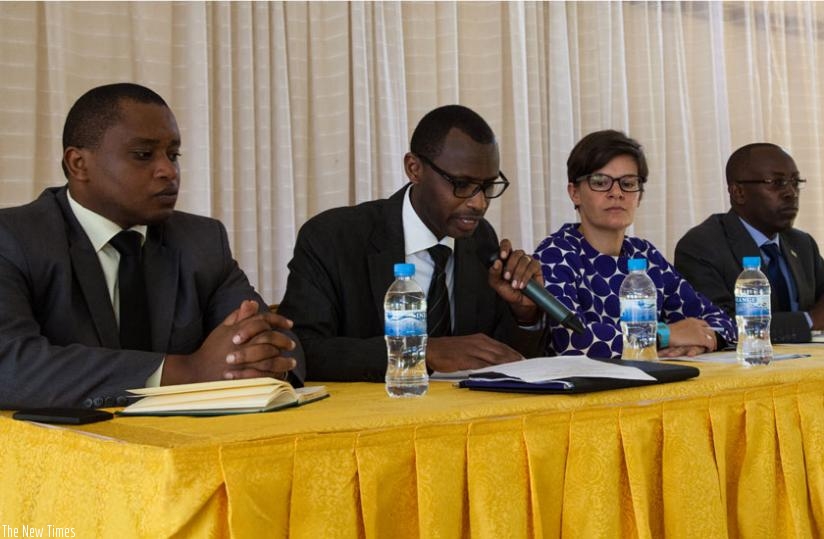 Minister for Education Papias Musafiri (2nd left) opens the workshop yesterday. With him is the State Minister for Primary and Secondary Education, Olivier Rwamukwaya (L), the head of UK's DFID, Laure Beaufils (2nd right) and the permanent secretary at the Ministry, Celestin Ntivuguruzwa (R). (Faustin Niyigena)