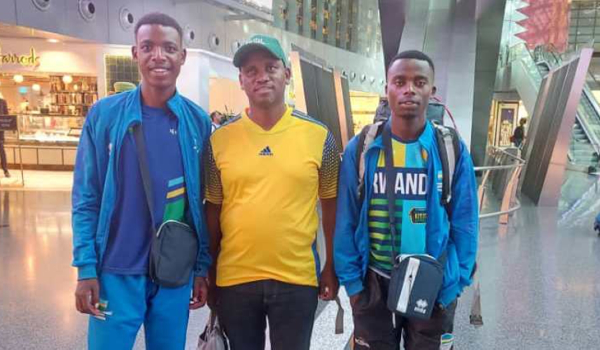 The national cycling coach Benoit Munyankindi, (centre) with Eric Manizabayo (right) and Moise Mugisha, two of the cyclists that will represent Rwanda at the 2022 UCI Road World Championships. Photo: Courtesy.