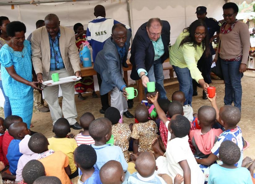 Schafer (center) and other officials serve milk to children in Rulindo District. (Jean d'Amour Mbonyinshuti)
