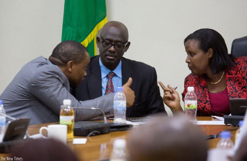 Olivier Rwamukwaya, the State Minister for Primary and Secondary Education (L),chats with Minister Gasinzigwa,(R) as Justice minister, Johnstone Busingye (C) looks on. (Timothy Kisambira)