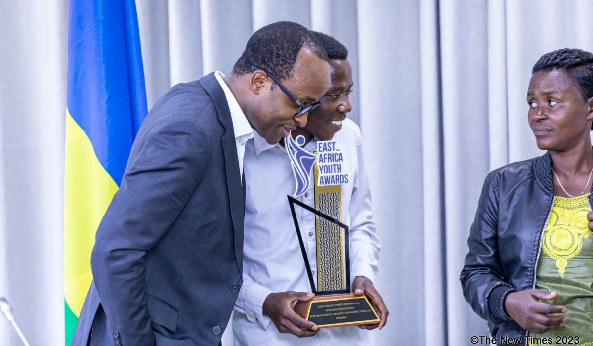 Minister of Education Gaspard Twagirayezu interacts with the 19-year-old, Emile Cyubahiro who is the overall winner in sciences as his mother looks on during the event in Kigali on December 4. Photo by Dan Gatsinzi