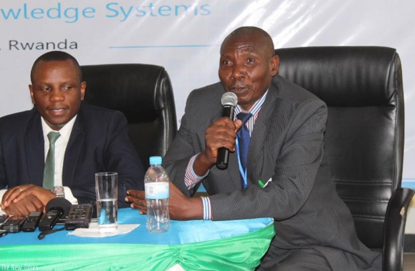 Gafaranga (R) speaks during the symposium as Dr Dushime looks on in Kigali on Monday. (Emmanuel Ntirenganya)