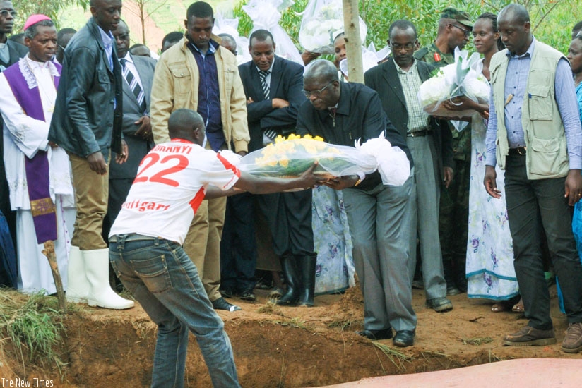 Prime Minister Murekezi lays a wreath of flowers to honor 35 victims of a landslide and floods in Gakenke District yesterday. (Teddy Kamanzi)