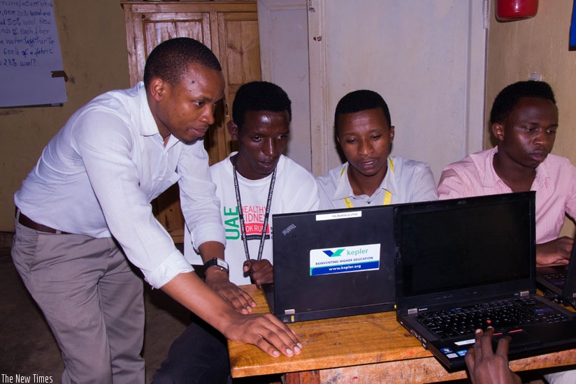 An instructor at Kepler Kiziba helps the students with computer work. (Teddy Kamanzi)