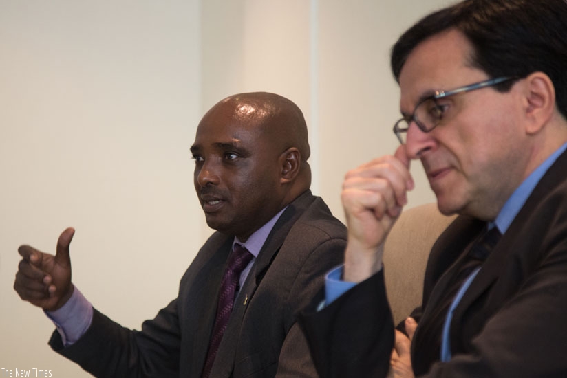 Pascal Nyamulinda, the director-general of the National Identification Agency, briefs journalists in Kigali yesterday as Joseph Atick, the chairperson of ID4Africa, looks on. (Timothy Kisambira)