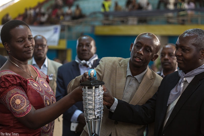 (L-R) Ministers Julienne Uwacu, Francis Kaboneka and Edouard Munyamariza, chairperson of Rwanda Civil Society Platform, light a flame during commemoration of over 100 employees of civil society organisations that perished in the Genocide. (Timothy Kisambira)