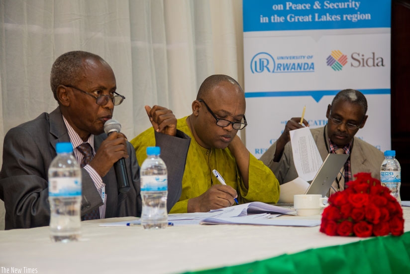 Prof. Nkusi (L) addresses participants as Ndahiro (C) and University of Rwanda don Dr Charles Gasarasi take notes at the conference in Kigali, yesterday. (Faustin Niyigena)