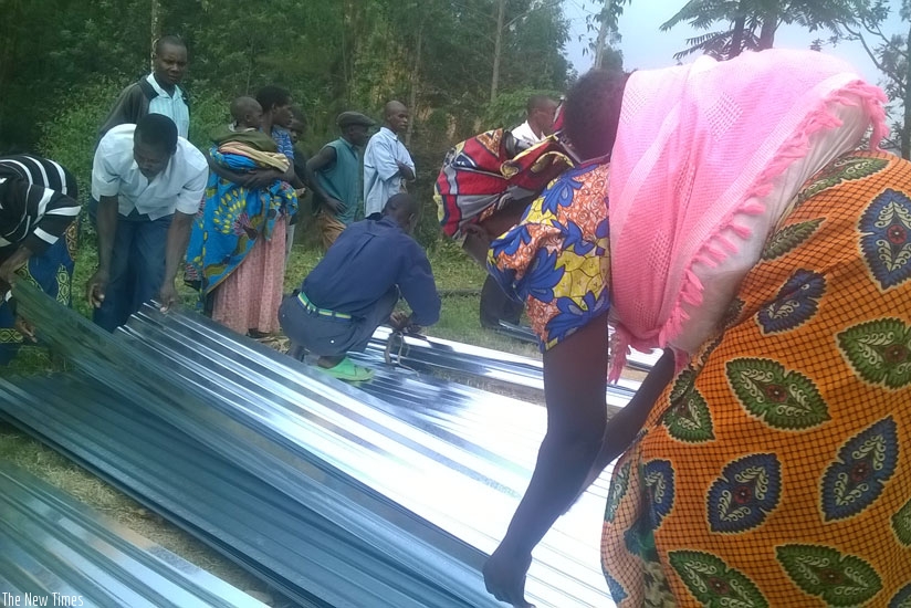 Gakenke woman picks her iron sheets she received from the World Vision on Thursday. (J.D Mbonyinshuti)