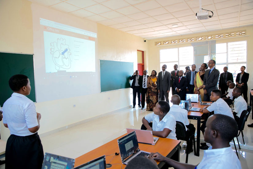 President Kagame and the First Lady Jeannette Kagame tour one of the newly-constructed classrooms handed over to a local school in Bugesera by the Rwanda Defence Forces, yesterday. The President said dignity and economic prosperity is the next stage of Rwanda's liberation, describing the end of the Genocide against the Tutsi as the end of the armed struggle and the journey ahead as another phase of liberation. (Village Urugwiro)